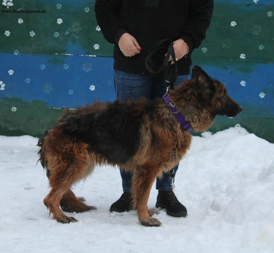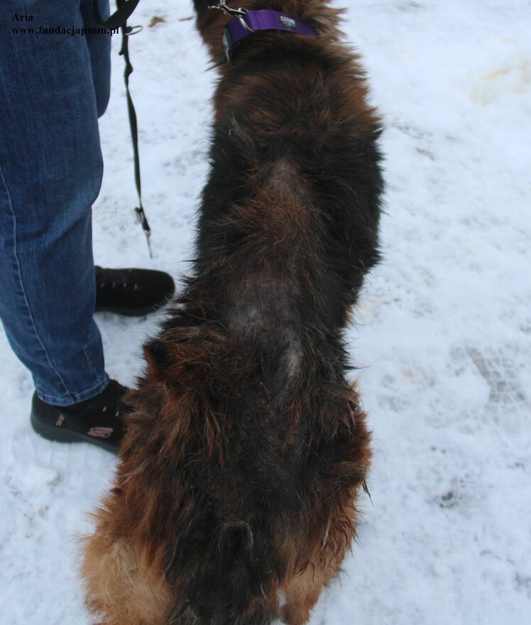 Aria to około 6 letnia sunia, która przyjechała do nas z Długosiodła. Suczka jest wychudzona i wyłysiała. Pozytywnie i przyjacielsko nastawiona do wszystkiego co ją otacza. Bardzo ładnie chodzi na smyczy, nie wyrywa się i nie ciągnie. Spuszczona ze smyczy na wybiegu nie oddala się od opiekuna, jest zawsze blisko. Przybiega na zawołanie, od razu podlatując do nogi by być wygłaskaną. Aria to suczka, która potrzebuje bliskości człowieka, jest bardzo kochana i opanowana.