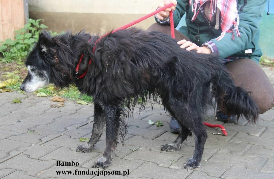 Bambo to staruszek 15 +, głuchy i z bardzo słabym wzrokiem. Przyjechał do nas bardzo, bardzo słaby i wyziębiony (hipotermia). Jest bardzo chudy, skołtuniony i zaniedbany. Nie wiemy jak taki staruszek mógł się zgubić skoro na ta chwilę ma problem ze zrobieniem samodzielnie paru kroków. Bambo wymaga ciepłego kącika, dokarmienia, dopilnowania przy jedzeniu. Większość czasu przesypia. Czekamy na cud, czekamy na olbrzymie serce, które podaruje takiemu dziadziowi ciepły kąt na ten czas, który mu pozostał.