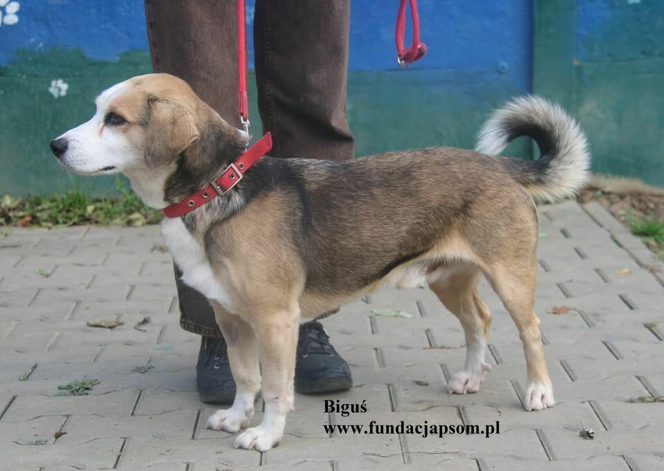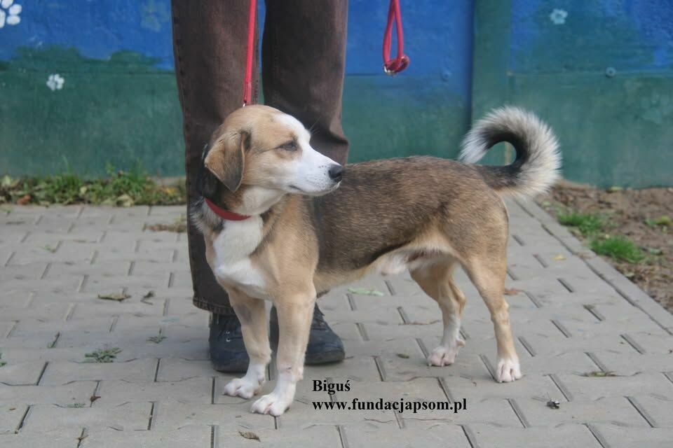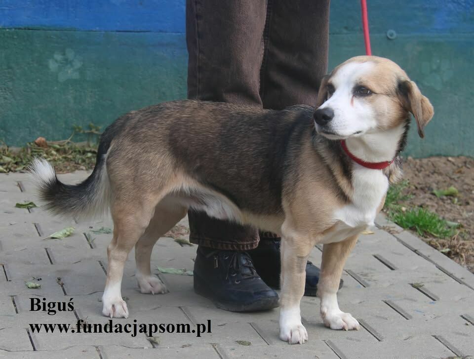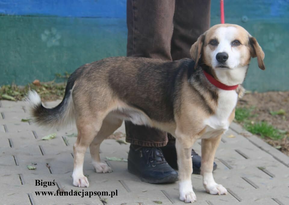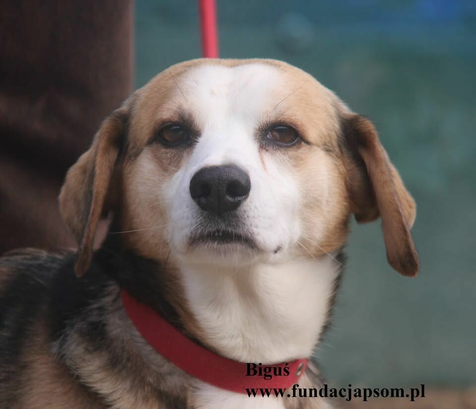 Biguś to niewielki piesek w typie beagla. Spokojny, bardzo towarzyski i proludzki. Wyczekuje głaskania i nadstawia się po jeszcze. Przytula się. Jest grzeczny, ułożony, ładnie chodzi na smyczy. Nie interesuje się innymi psami, nie jest zaczepny. Biguś przyjechał do nas z Sochaczewa.