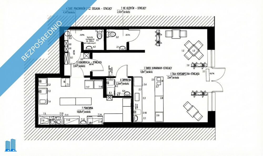 • Układ: Sala obsługi, 2 łazienki (klient/personel), zmywalnia, zaplecze.
