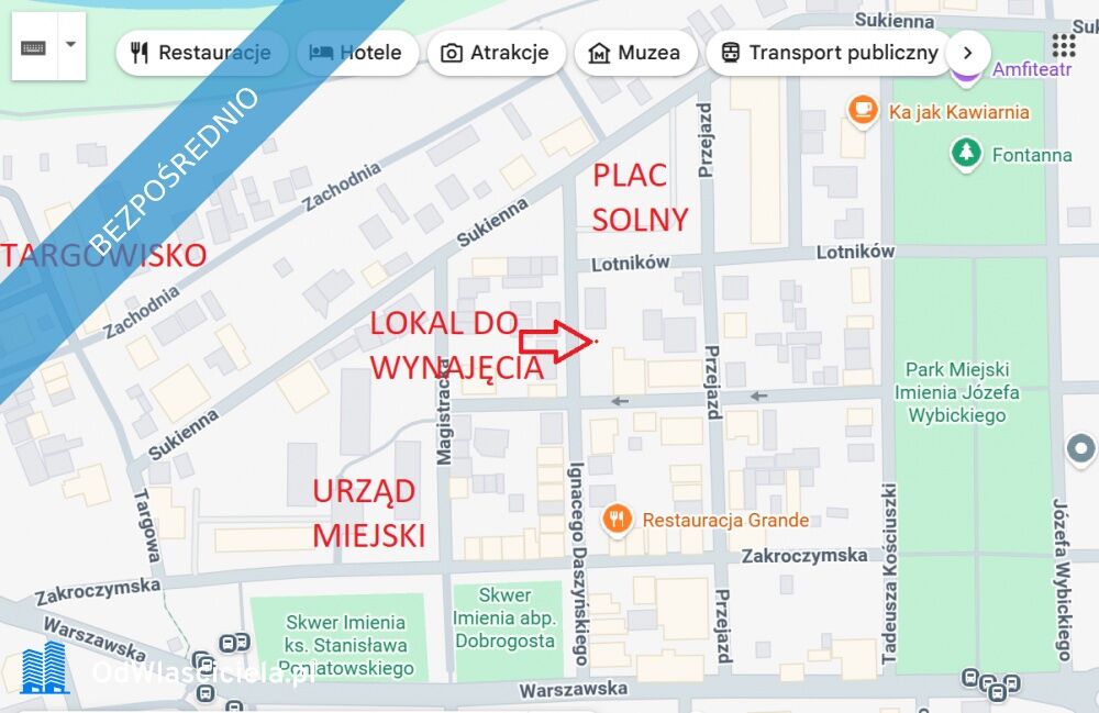 ? Lokalizacja: 50 m od Placu Solnego, 180 m od ul. Warszawskiej, 200 m od Urzędu Miejskiego. Duży ruch pieszy i nowa zabudowa wokół.