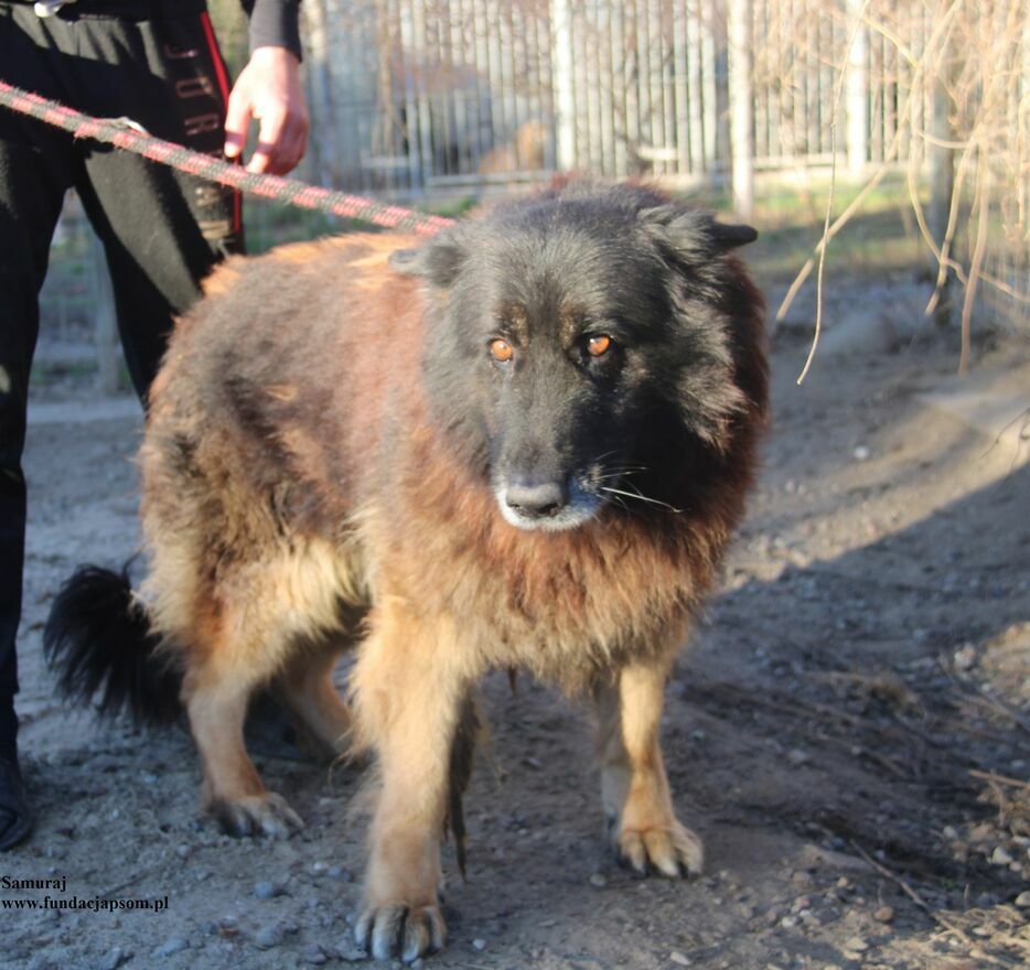 Samuraj to pies, który przyjechał do nas dwa lata temu z miejscowości Stara Grabownia, gmina Ostrów Mazowiecka. Piesek ten musi być jedynakiem w domu, ponieważ nie akceptuje innych zwierząt. Ma około 7-8 lat i mimo swoich gabarytów jest to piesek, który jest bardzo przytulaśny, uwielbia mieć człowieka blisko siebie, zachowuje się jak szczeniak w ciele dorosłego psa. Samuraj posiada przeszywający wzrok, który może być błędnie interpretowany przez człowieka i odebrany jako możliwość ataku ze strony pieska. W rzeczywistości jednak kipi w nim chęć przytulenia się do człowieka, uwielbia być głaskany po brzuszku, i miziany za uszkiem. Piesek umie chodzić na smyczy, pamiętać trzeba jednak o tym, że ma w sobie dużo siły i może mocno na niej pociągnąć opiekuna.