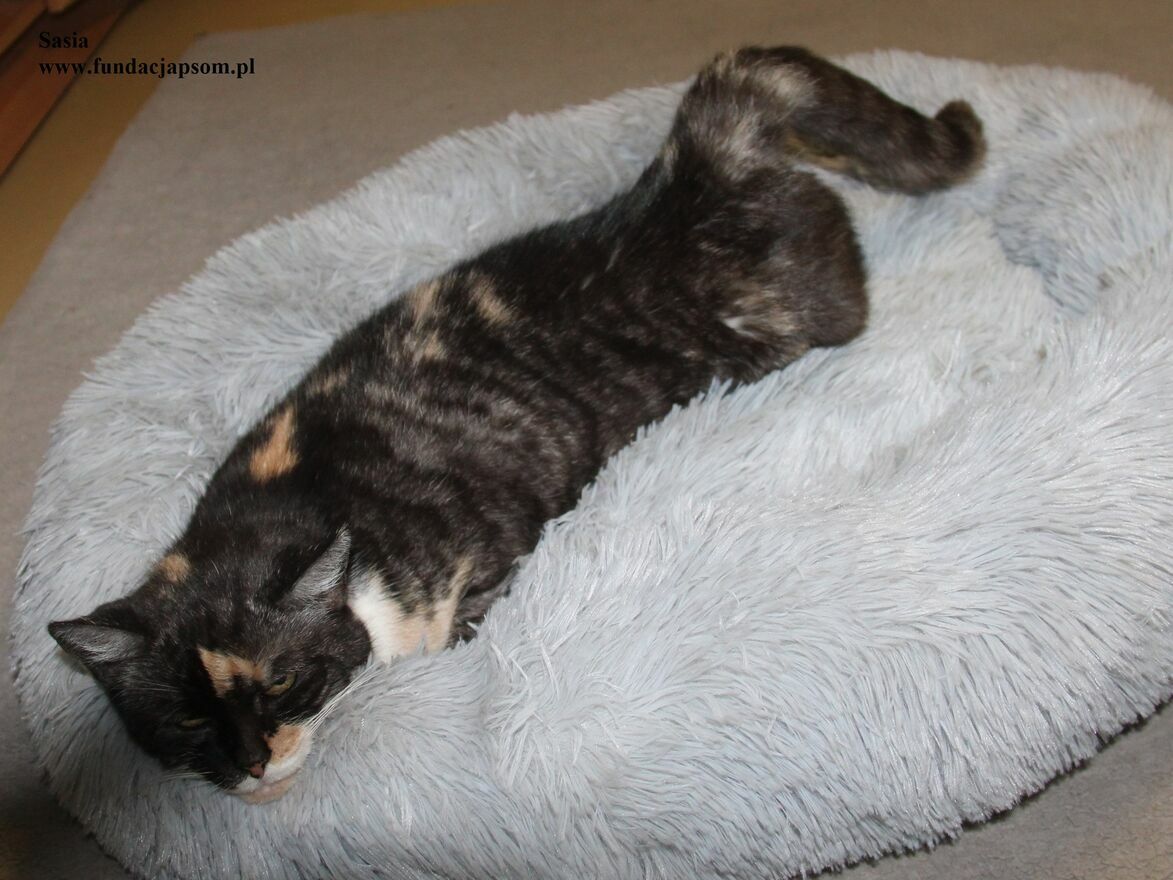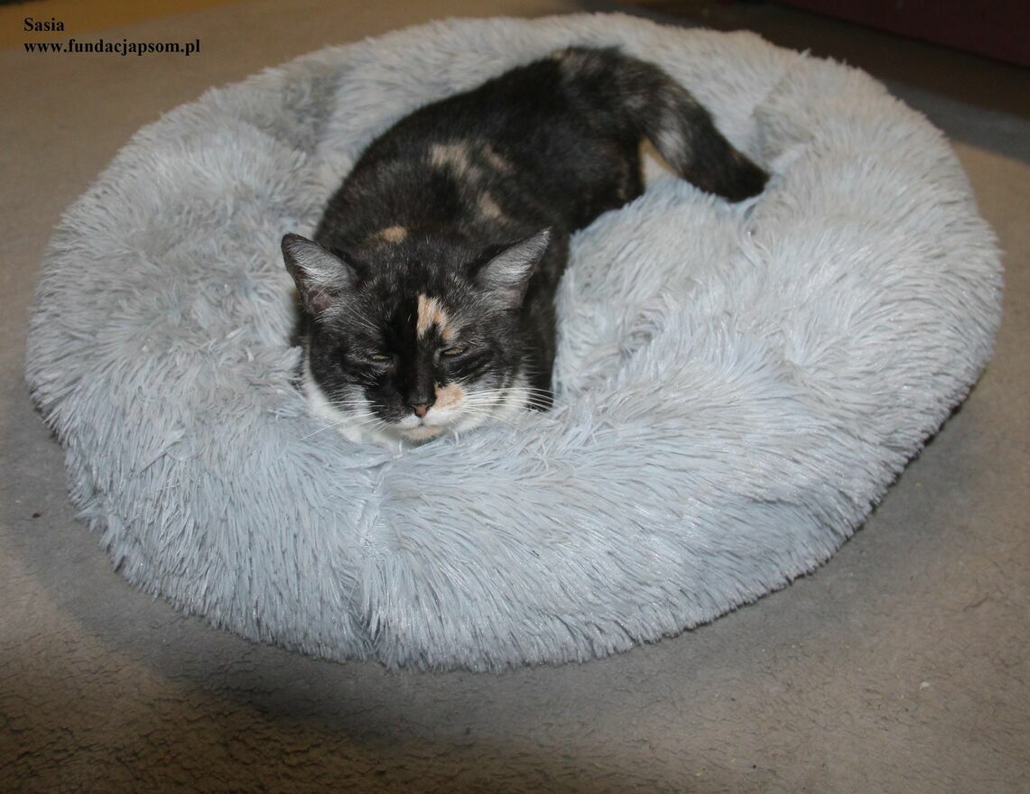 Nie udało nam się zrobić zdjęć w pozycji stojącej, ponieważ kotka wolała wtulać się i kokosić w puszyste legowisko i kocyk.