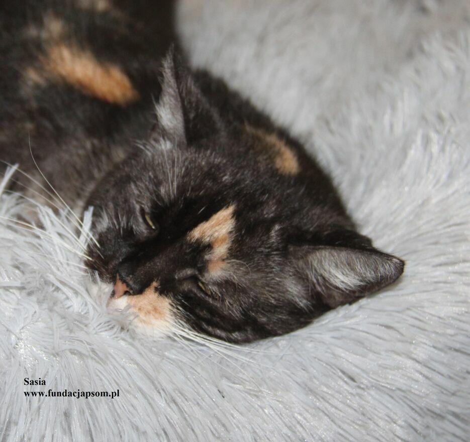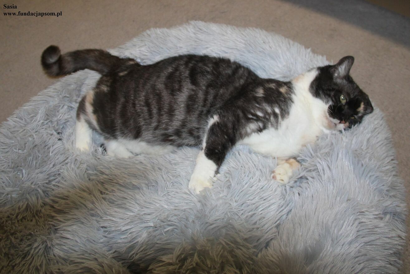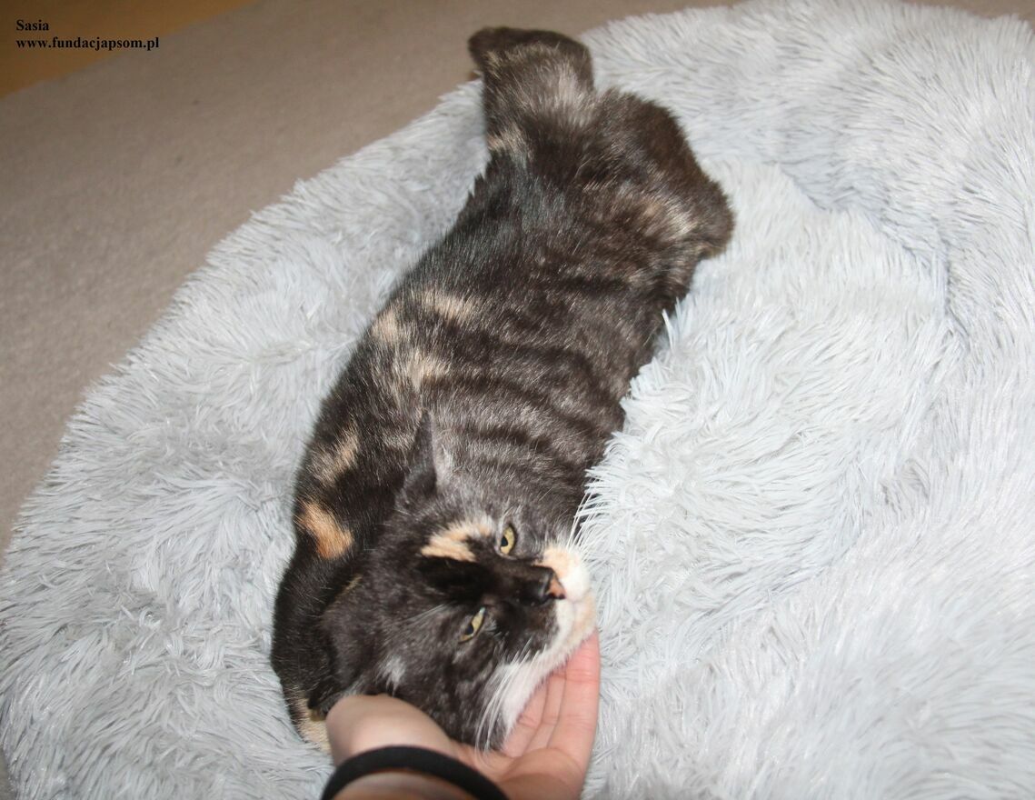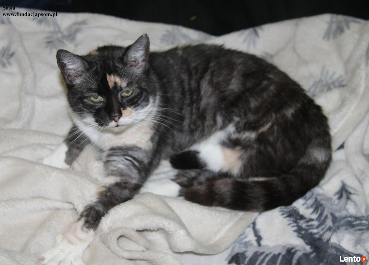 Sasia to około dwuletnia kotka, która przyjechała do nas z Legionowa. Przebywała w tamtejszej klinice z powodu złamania lewej kości udowej i niestety ale złamanie nie nadaje się do dalszego leczenia. Sasia pomimo tego jest sprawnym kotem, bez problemu przemieszcza się i wskakuje na łóżko. Kotka jest energiczna, i bardzo przyjaźnie nastawiona na człowieka. Widząc zbliżającego opiekuna zaczyna mruczeć, podchodzi aby się połasić, i przepięknie miauczy.