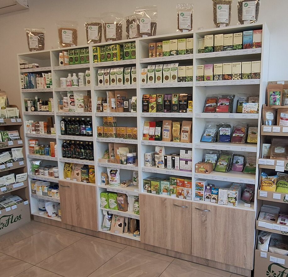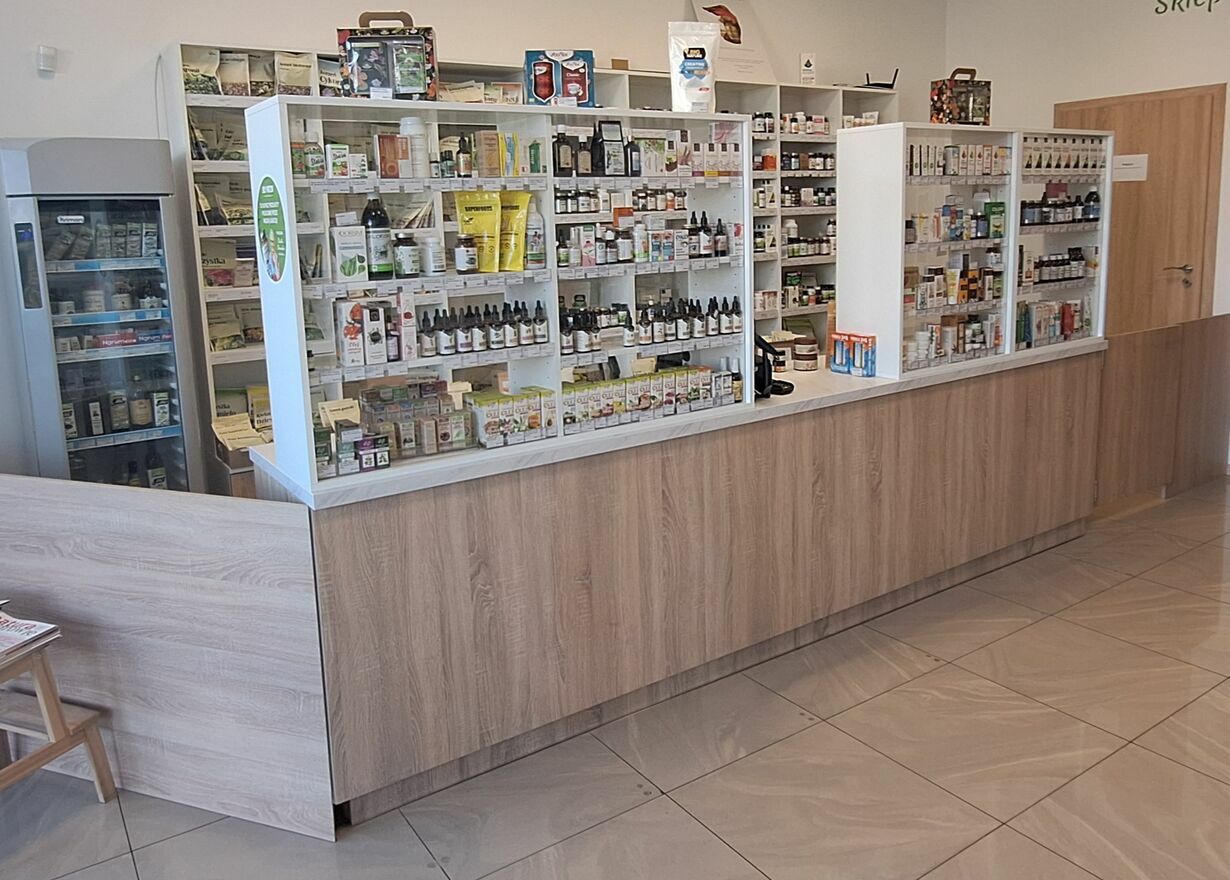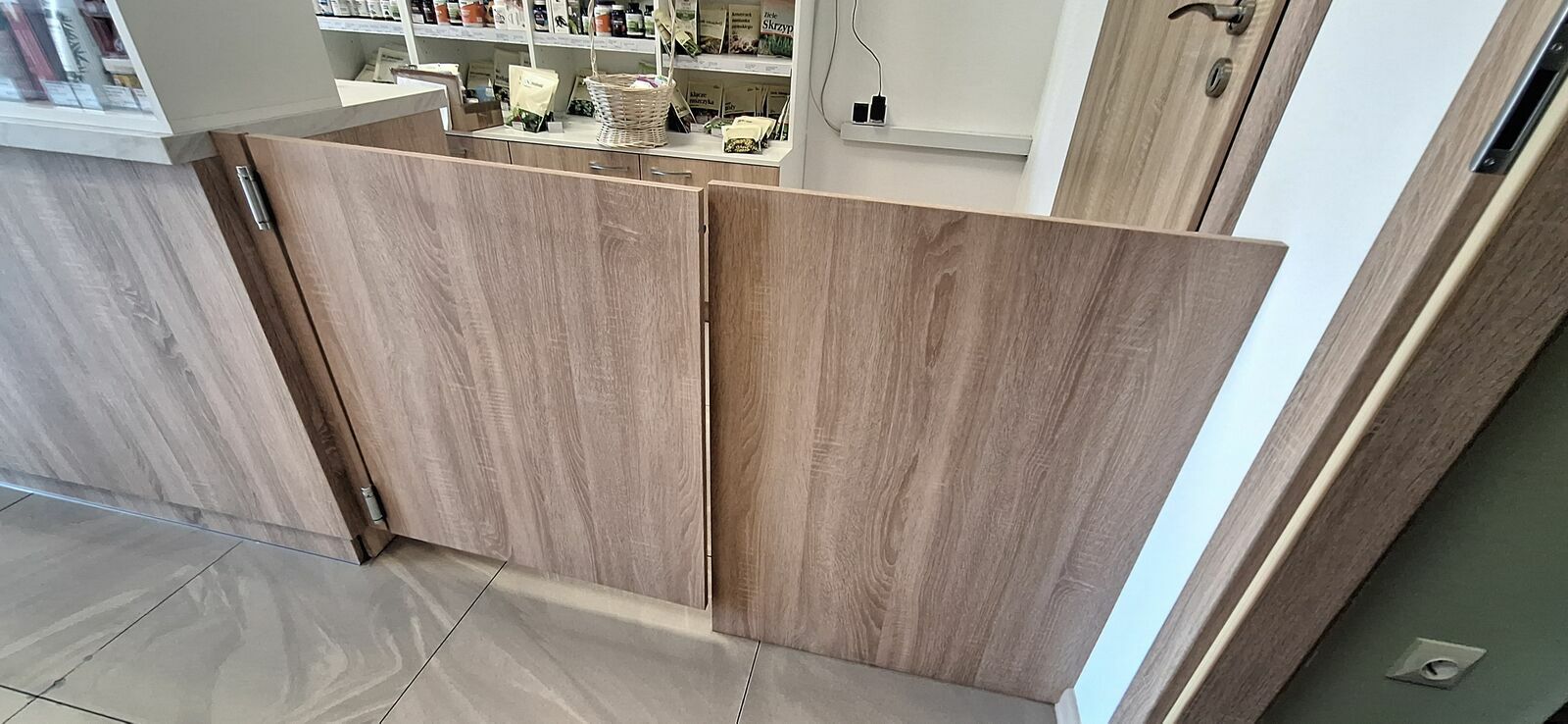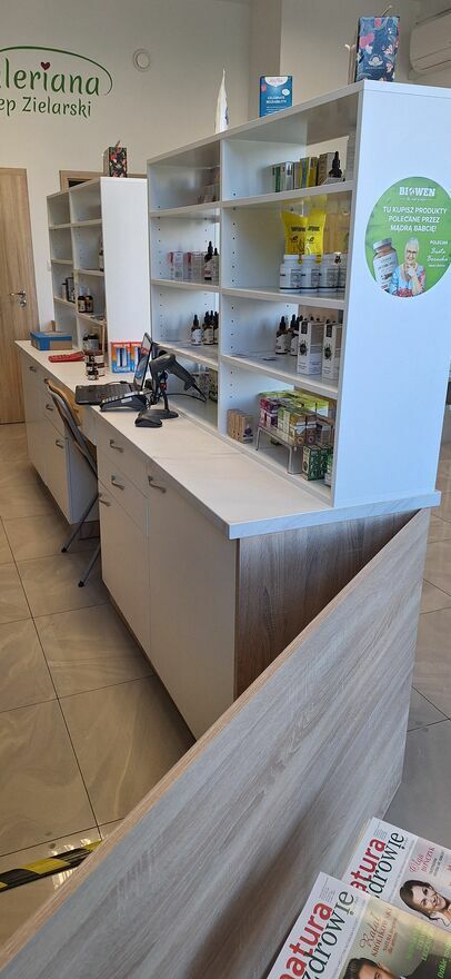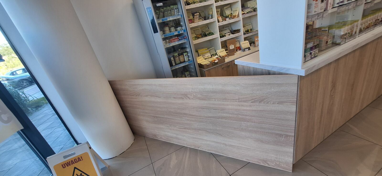 Sprzedam komplet mebli sklepowych białych z frontami w kolorze bielonego dębu:Lada sprzedażowa szer 350cm wys 90cm gł 54,5cm