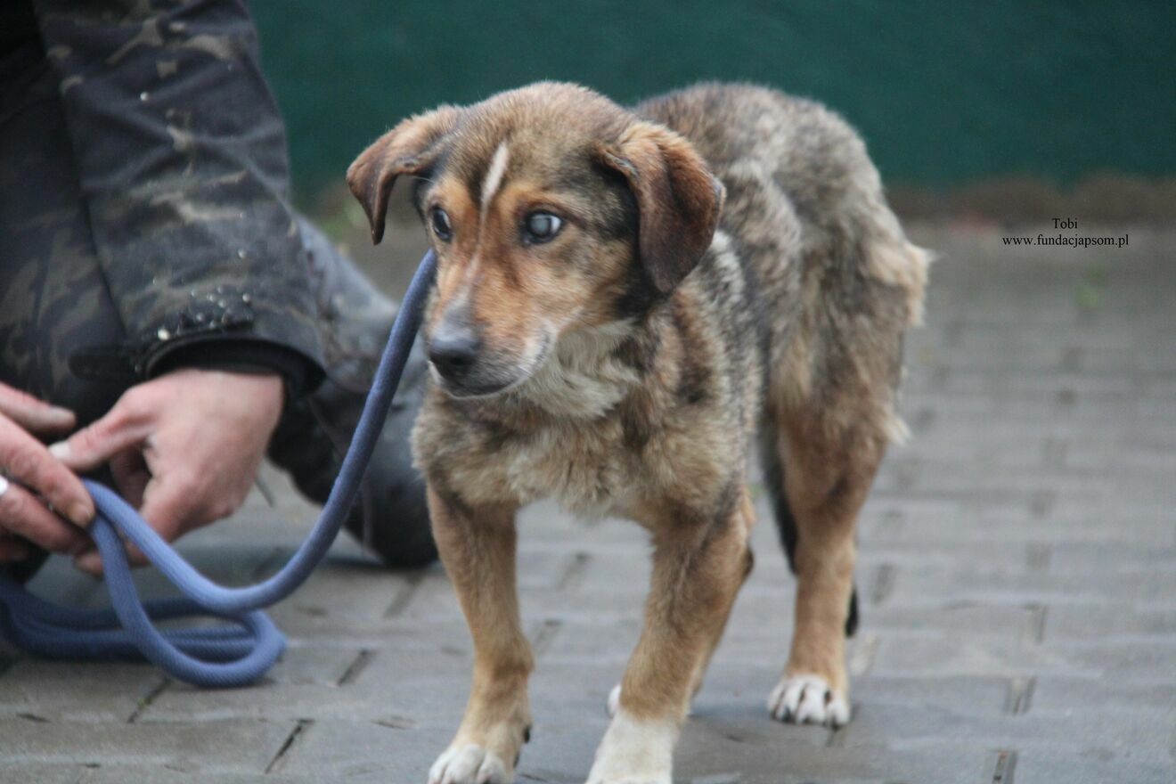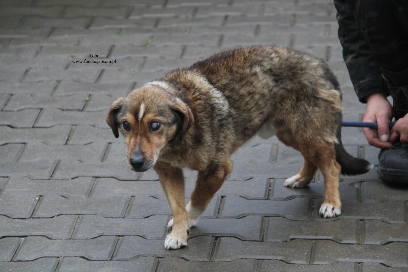 Tobi został znaleziony na terenie gminy Leoncin. Tobi to starszy pies, spokojny, pełen czułości i ogromnej wdzięczności. Bardzo przyjazny, uwielbia kontakt z człowiekiem. Cichy, spokojny, zamiast długich spacerów wystarczą spokojne przechadzki, ciepłe legowisko, troska i spokój. Tobi to żywy dowód na to, że z brakiem wzroku i w podeszłym wieku można mieć niesamowicie kochające i lojalne serce. Wniesie do nowego domu spokój, czułość i wdzięczność.